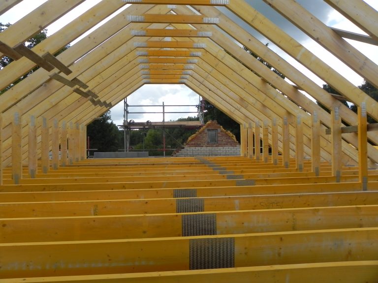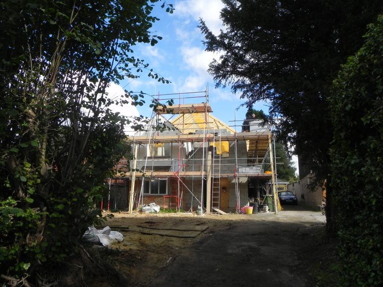 We built two corner infill two storey extensions, one at the front and one at the back, replaced the rotten roof structure with its spray foam insulation with a trussed roof.